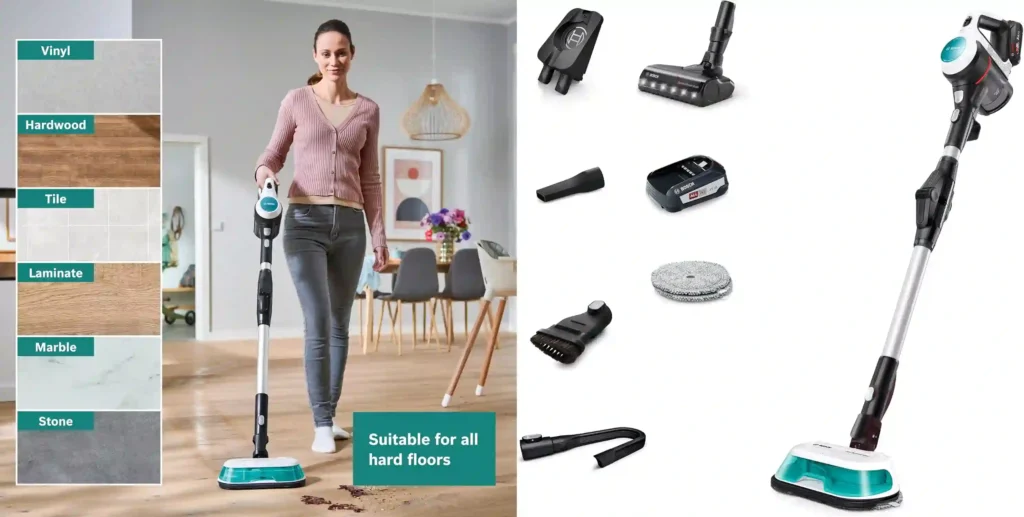 Bosch Unlimited 7 BCS71HYG1 er Bosch ledningsfri støvsuger bedste i test takket være dens DynamicAqua Mop, der kombinerer kraftfuld støvsugning og mopning i én arbejdsgang. Vores tests viste, at dens sugekanal effektivt fjerner støv og løst snavs, mens de roterende Power Spinning Pads tackler genstridige pletter på hårde gulve som fliser og parket. HEPA-filtret fjerner 99,97 % af støvpartikler, hvilket gør den ideel for allergikere.