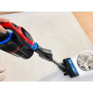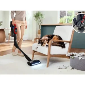 Vi testede støvsugeren i danske hjem med hunde og katte på tæpper, trægulve og polstrede overflader. Flex Tube gør det nemt at nå under sofaer, mens den lette vægt på 3,7 kg sikrer komfortabel brug. Støvbeholderen på 0,4 liter tømmes hygiejnisk med en komprimeringsskyder, hvilket reducerer tømningshyppigheden med op til 50 procent.
