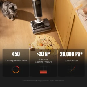Vores tests af Roborock 2-i-1 Støvsuger F25 RT bekræfter, at dens sugeevne på 20.000 Pa effektivt fjerner både tørt støv og våde spild. JawScraper Roller, med en rotationshastighed på 450 RPM og 20 N tryk, sikrer pletfrie gulve uden sammenfiltring af hår, hvilket gør den perfekt til kæledyrsejere. Batteriet holder i 40 minutter i Eco-tilstand, hvilket dækker store områder, og den store 870 ml rentvandstank reducerer behovet for genopfyldning.